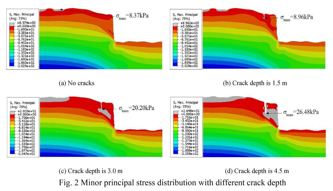 针对这一重大需求,侯天顺副教授团队揭示了降雨作用下裂缝深度和裂缝宽度对崩塌体稳定性的影响,以及崩塌体的失稳破坏机理。依托中国科学院水利部水土保持研究所长武黄土高原农业生态试验站,团队基于流固耦合原理和强度折减法,采用有限元方法对不同裂缝深度和裂缝宽度的崩塌体进行数值模拟计算,研究强降雨作用下裂缝对黄土崩塌的影响。研究结果表明,随着降雨的入渗,一方面使崩塌体自重增大,坡脚剪应力增大。另一方面,雨水从崩塌体外边缘渗出时会产生渗透力,增大崩塌体的倾覆力矩。裂缝深度逐渐增加的过程中,裂缝尖端拉应力值逐渐增大,崩塌体向临空面的倾倒趋势越来越明显,塑性区从坡脚逐渐延伸到了裂缝尖端处,崩塌体安全系数逐渐降低甚至小于1。随着裂缝宽度的增加,崩塌体重心逐渐外移,坡脚和裂缝尖端处土体变形逐步增大,崩塌体稳定性不断降低。
